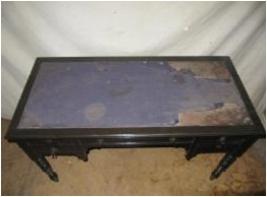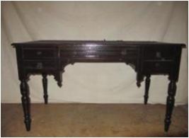 | Description / विवरण | Rectangular table with four legs, having five drawers. The working surface is topped with cloth. |