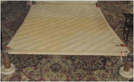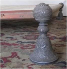 | Description / विवरण | Maharaja bed having four legs made of wood & over carved by silver frame with very intricate design. Except legs other part of wood is simple. The surface is made of cotton beets i.e. newar |