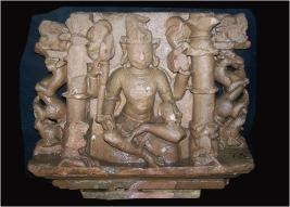 | Description / विवरण | Within the two pilasters wearing a jata-mukuta four armed Siva seated in lalitasana. The upper right hand contains a trident, lower holds a fruit, the upper left hand holds an object which is not clear and lower hand holds a disc like object which is unclear. Near the pilaster two Bhakatas are shown in anjali mudra partly damaged. The top portion of right pilaster is slightly damaged. Outside the right pilaster it contains Makara, Vyala and Gaja. Same scene is repeated the corresponding side. |