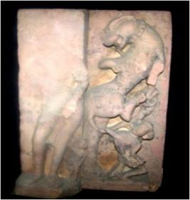 | Description / विवरण | The panel depicts two faces. The front is highly mutilated but retains the leg portion with a lady near the feet to the left side. The left side face depicts a vyala and below a male figure has been shown but slightly damaged. |