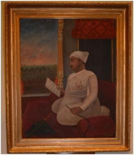 | Description / विवरण | Oil Painting on canvas portraying Nawab Nazim Mir Qasim in sitting posture. Fitted in an ornamental wooden frame. |