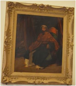| Description / विवरण | Oil Painting on canvas portraying Nazir Darwali Khan, seated on a red velvet cushioned chair. Fitted in a wooden frame. |