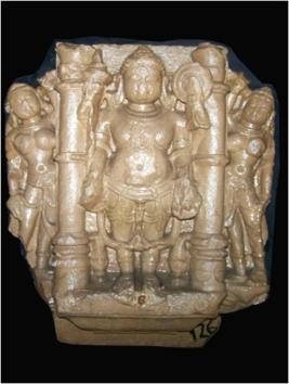 | Description / विवरण | Within the two pilasters, there stands Vamana, with four hands. The right upper hand holds a club, the lower right hand is not clear. The upper left hand holds a cakra, the lower left hand holds a conch. Near the feet, two flower buds are kept on each side. Outside of the two pilasters two female chouri bearers are depicted one on each side. |