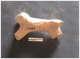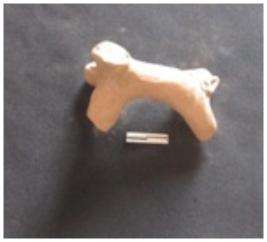 | Description / विवरण | Animal figurine having horizontal marks on his neck and back portion of his body with appliqu tail. All the legs as well as head are broken. |
