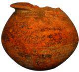 | Description / विवरण | Red ware pot with round base and globular body. Slightly carinated waist with sloppy shoulders, convex neck with splayed out externally thick flat rim. Partly broken rim. A prominent groove on the waist. Multiple grooves below the rim. |