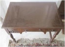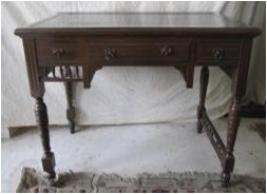 | Description / विवरण | Wooden table with three drawers & four carved legs. Central drawer having ring kabs, where as sides having only one each. |