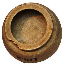 | Description / विवरण | Pot carved in stone having splayed out externally thickened rim, carinated shoulder and flat base. |
