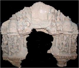 | Description / विवरण | The torana portion containing flying figure on both sides, two miniature temples containing the image of Ganesa and Siva are shown on it. Both ends depict Vinavadani and a male on makara. |