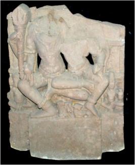 | Description / विवरण | A higly mutilated image of Uma Maheshwara seated in lalitasana. Siva contains a trisula in his upper right hand and holds a fruit in his lower right hand. Devi holds a Darpana in her left hand. Below Nandi Bull, a male and a lion have been depicted. To the right it contained an image of seated Ganesa and the corresponding side depicts a seated male figure holdings a pot in his left hand. |