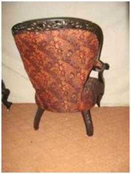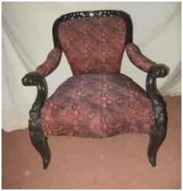 | Description / विवरण | Four wheeled single seated sofa having decorated raised back. All four wheels are missing. |