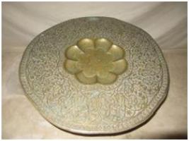 | Description / विवरण | This brass plate having molded design it self of floral pattern. The center of the plate is in depth & is plane. One sprit crusted ring has been fixed on periphery of it. |