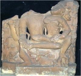 | Description / विवरण | A highly mutilated image of Uma Maheshwara. Seated in lalitasana. Arms and heads of Siva and Parvati are missing. Near the seat Nandi bull, a male figure and the lion have been shown but all are badly mutilated. Female attendants have been depicted to the left of the right side of the central image. |