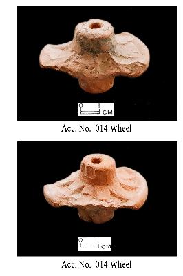 | Description / विवरण | A decorative double-convex wheel of red fabric having impressed spokes on both sides forming notch pattern in between them. Broken at sides in such a way that its circumference is not complete. Mold technique has been used. |
