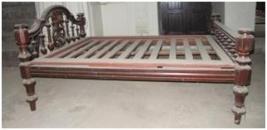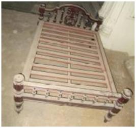 | Description / विवरण | Single bed palang raised on two sides & having carved designed four legs. The raised sider having carved floral pattern in jalli pattern. The parallel wooden bars are arranged for fixing up the cushion. |