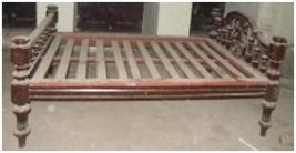 | Description / विवरण | Single bed palang raised on two sides & having carved designed four legs. The raised sides having beautiful carved floral pattern in jali system. The parallel wooden, bars are arranged for fixing up the cushion. |