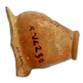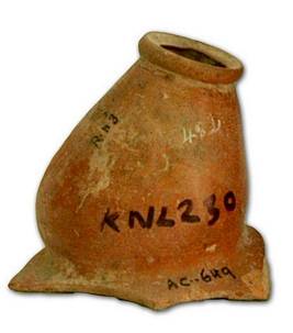 | Description / विवरण | Broken red ware Sprinkler with narrow projected top and circular opening, and broad at the base having seven perforation. |