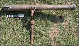 | Description / विवरण | This is small gun cast in bronze known as a Narnal . The barrel is tapered from breech to mouth with thick round rim. The trunnions are small cylindrical projections in the middle of the gun engaged with iron fork swivel. Two inscriptions is engraved on the cannon. The muzzle rim is provided with for site point and in the same alignment back site U is provided on the breech ring. The vent hole is seen at the breech end of the cannon on the right hand. |