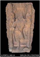 Standing male divinity probably Vishnu with one left and two right arms logographs other side-head lost.