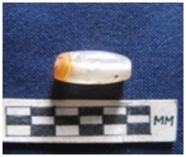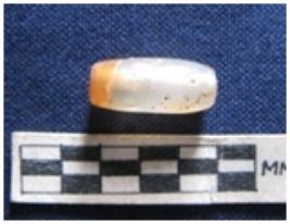 | Description / विवरण | A barrel shaped stone bead. One side is partially broken |
