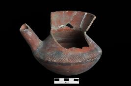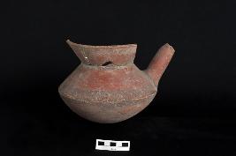 | Description / विवरण | A spouted jar with a flaring rim, bluntly carinated body and a round bottom; the tubular spout is obliquely luted on the shoulder. The spouted jar is painted with a horizontal band on the carination of the body on which rest oblique strokes all around. |