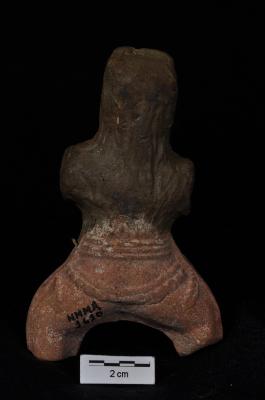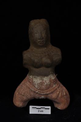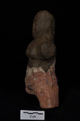 | Description / विवरण | Terracotta female figurine, with prominent features, partly broken legs. |