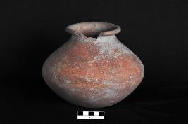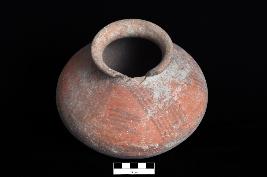 | Description / विवरण | A globular jar with a convex profile & an out curved, undercut rim. It is painted on the upper portion of the outer surface in the form of series of horizontal bands in between vertically placed slating lines. |