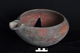 | Description / विवरण | Convex sided bowl provided with a short channeled spout. It is painted on the upper outer half in the form of parallel, slanting, vertical bands. |
