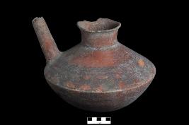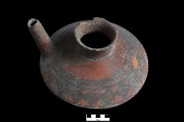 | Description / विवरण | A spouted jar with a blunt carination, round base, concave neck and a slightly out curved rim. The tubular spout is looted on body above the carination. It is painted on the outer surface. A horizontal latticed zone formed of oblique lines set in horizontal band; over the uppermost horizontal band are small arches and at the bottom is a zigzag band set in horizontal bands. |