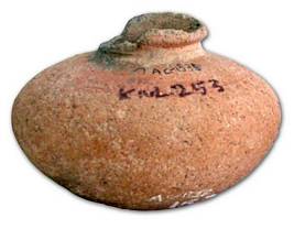 | Description / विवरण | Medium size red ware pot with round base and globular body, concave neck with splayed out thick rim, a groove on the shoulder faintly seen . |