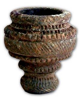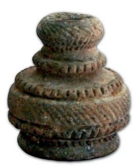 | Description / विवरण | Black ware lid with stepped terraces. The central band is decorated with slanting lines flanked by nail tipped designs. Below it is a recess depicted with pinched nail design. Above it is a circular knob decorated with slanting lines which look likes amalaka of a temple sikhara. |