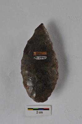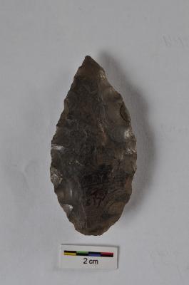 | Description / विवरण | Leaf shaped point, flake scars on both surface, retouched along the periphery. |
