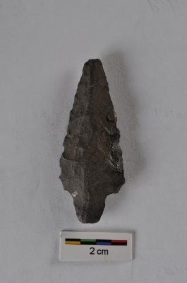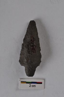 | Description / विवरण | Triangular point, flake scars on both surface, retouched along the periphery, pointed base for hafting. |