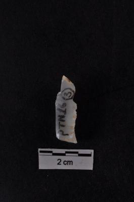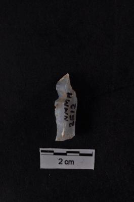 | Description / विवरण | Flake with pointed distal end, proximal end broken, a ridge on dorsal surface. |