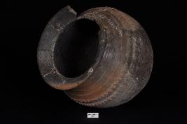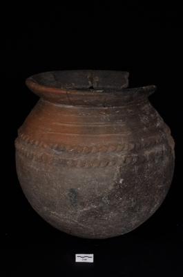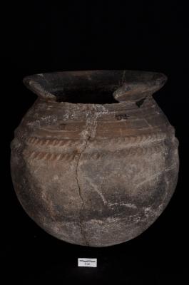 | Description / विवरण | Grey ware round base pot out-curved rim with incised design. |