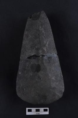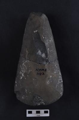 | Description / विवरण | Polished stone axe, pointed butt end, convex working edge. |