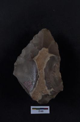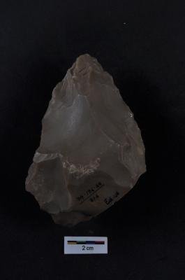 | Description / विवरण | Handaxe, flaking on both surfaces, cortex visible on one surface, pointed end. |
