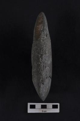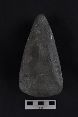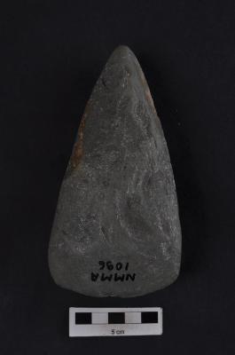| Description / विवरण | Stone axe, pointed butt end, convex working edge, slightly rough surface. |