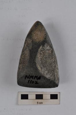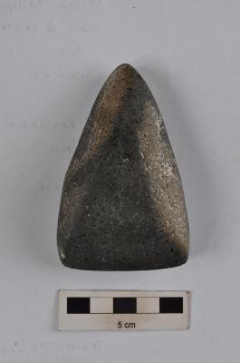 | Description / विवरण | Polished stone axe, pointed butt end, straight working edge, rough surface. |