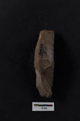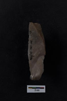 | Description / विवरण | Utilized flake, with one straight and another convex working edge, prominent bulb with prepare platform at proximal end, use-ware marks on both working edge. |