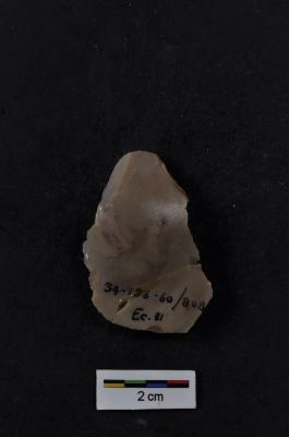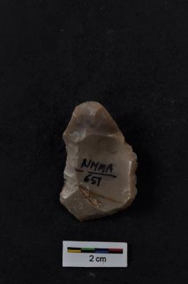 | Description / विवरण | Utilized flake, prominent bulb on ventral surface, striking platform absent, retouches on edge. |