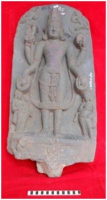 | Description / विवरण | Standing four armed Vishnu flaked by Lakshmi and Saraswati on either side below. He wears the crown, Necklace, Kundala, Upavita and Banamala, armlets etc. He holds Padma and Gada in lower and upper right hands and conch and Chakra on lower and upper left hands. |