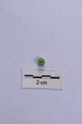 | Description / विवरण | Green color glass bead, globular shape, with perforation, smooth glossy surface. |