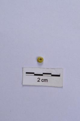 | Description / विवरण | Glass bead, short circular shape, with perforation, yellow in colour, smooth glossy surface. |