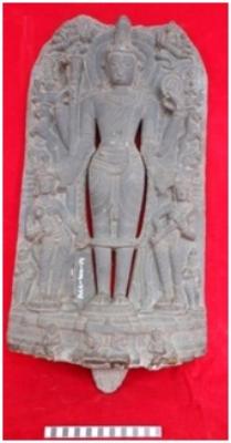 | Description / विवरण | Standing four armed Vishnu in Samapada sthanaka pose on a lotus and flanked by Lakshmi and Saraswati below on right and left side respectively along with other attendants. He is wearing kirita, kundala, Necklace, Upavita, Banamala. Stella is richly carved. He is holding gada on upper right hand chakra on upper left hand. Lower two hands are broken. Top of the Stella is broken. |