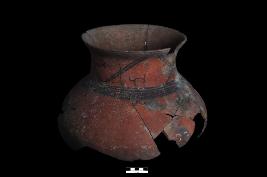 | Description / विवरण | A globular jar with vertical neck & flared out rim resulting in wide mouth & squat body. It is painted in the form of four horizontal bands around the neck underlined by zigzag lines; on the upper most band, are seen three dogs. bands. |