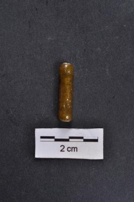 | Description / विवरण | Glass bead, tubular shaped, circular cross-section, yellow ocher in colour, smooth glossy surface, with perforation |
