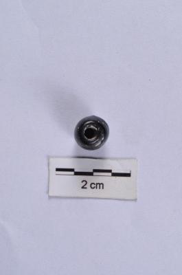 | Description / विवरण | Glass bead, globular shape, black in colour, smooth glossy surface, with perforation |