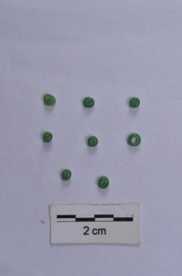 | Description / विवरण | 9 glass beads, globular shaped, smooth glossy surface, with perforation |