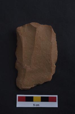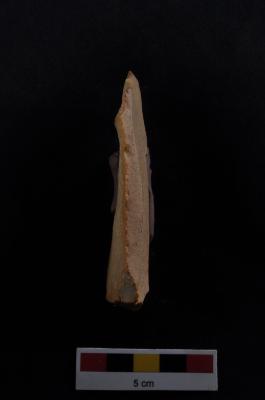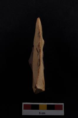| Description / विवरण | Blade, parallel sided, diffused bulb with striking platform at proximal end, use-ware marks on both working edge. |