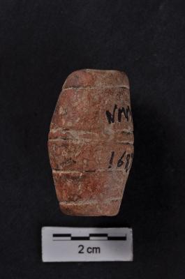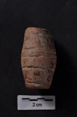 | Description / विवरण | Bead, biconical shape without prominent ridge, handmade, incised lines on outer surface. |